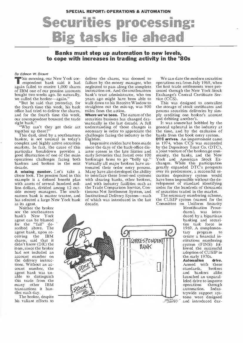 The nature of the securities business has changed dramatically in the last decade. A full understanding of those changes is necessary in order to appreciate the challenges facing the industry in the Eighties. Impressive strides have been made since the days of the back-office disaster scenes in the late Sixties and early Seventies that forced over 100 brokerage firms to go “belly up.” Virtually all major brokers have automated their order entry process. Many have also developed the ability to interface these front-end systems with clearing banks, other brokers, and with industry facilities such as the Trade Comparison Service, Continuous Net Settlement System, and Institutional Delivery System each of which was introduced in the last decade.